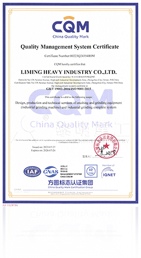 Maquinaria Liming en la misma industria a través de la Certificación del Sistema Internacional de Gestión de Calidad ISO (ISO9001: 2000), la Certificación CE de la Unión Europea y la Certificación ERC de Rusia. Después de más de 30 años de arduo trabajo, la marca de equipos de molienda, hornos y trituración siempre ha estado en un nivel superior en la industria, y LIMING es muy elogiada por los clientes nuevos y antiguos en el país y en el extranjero.