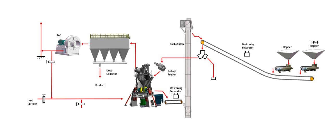 Depósito de materia prima -> Alimentador -> Molino vertical -> Clasificador de aire de alta eficiencia -> Filtro de mangas pulsante -> Depósito de producto terminado -> Envasado o a granel