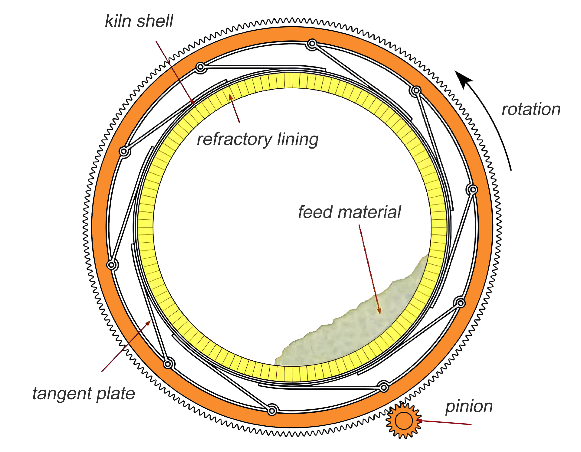 El material se introduce en el horno por la parte trasera (extremo superior). Debido a la inclinación y la lenta rotación del cilindro, el material avanza gradualmente mientras gira axialmente y radialmente. El combustible se inyecta en el horno a través del quemador situado en la parte delantera (extremo inferior) para su combustión. El calor se transfiere al material por radiación y conducción. Durante su movimiento, el material forma una fase líquida, generando minerales como silicato tricálcico, silicato dicálcico, aluminato tricálcico y aluminoferrita tetracálcica. Una vez completado el proceso de sinterización, se forma el clinker, que se descarga por la parte superior del horno.