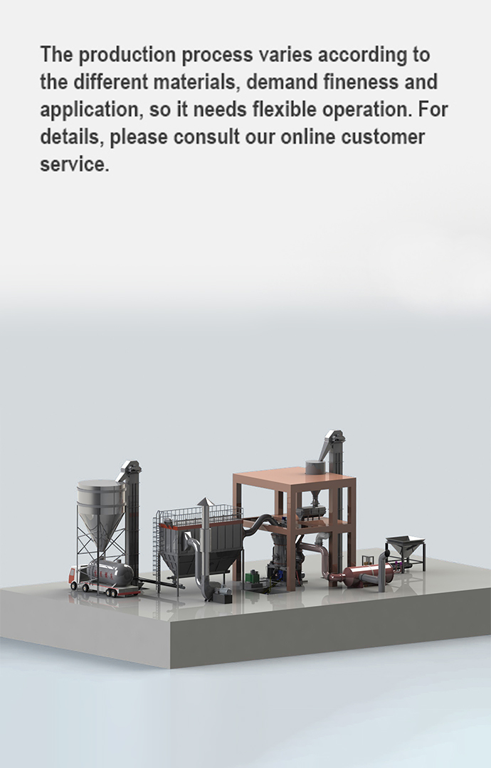 Fine powder complies with the fineness and airflow go through the pipe into the dust collector for separation and collection. The finished powder will be transmitted to bucket elevator by screw conveyor and lifted into Silo for storage by Bucket elevator , then packed uniformly by powder tanker or automatic packing machine.