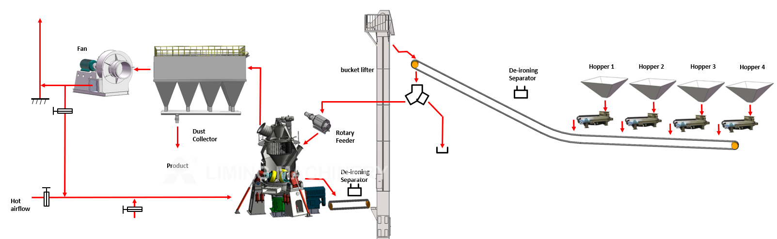 Debido a la compleja composición, el alto contenido de humedad y las diferencias significativas en la capacidad de molienda de las materias primas, LIMING MACHINERY ha dedicado más de veinte años al desarrollo del equipo de molienda de bajo consumo LMR, que integra secado, molienda, clasificación y transporte. Este equipo presenta ventajas tales como alta eficiencia de molienda, bajo consumo de energía, gran tamaño de las partículas de alimentación, finura del producto fácilmente ajustable, flujo de proceso sencillo, tamaño reducido, bajo nivel de ruido, baja emisión de polvo, fácil operación y mantenimiento, bajos costos operativos y bajo consumo de materiales resistentes al desgaste. El rendimiento general del producto alcanza niveles avanzados a nivel internacional, satisfaciendo las necesidades de molienda industrial a gran escala, inteligente e intensiva. La capacidad máxima de producción puede alcanzar las 550 t/h, satisfaciendo las necesidades de suministro de materia prima de las líneas de producción de cemento con una capacidad de 200-2500 t/d.