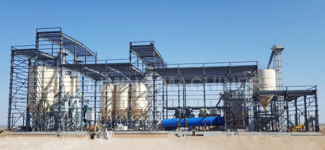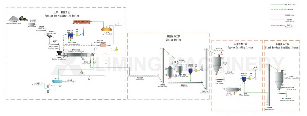Utilice una cargadora para transportar las materias primas de mineral de yeso desde la pila de materias primas hasta la tolva de acero receptora. El mineral de yeso de gran tamaño se tritura hasta alcanzar el tamaño de partícula requerido mediante el equipo de trituración, y los materiales que cumplen los requisitos de tamaño de partícula se almacenan en el depósito de materias primas a través del equipo de transporte. Las piezas pequeñas de material se dosifican y se transportan al molino para su trituración, donde el material en forma de bloques se tritura hasta convertirlo en polvo para alcanzar la finura requerida para el proceso. El polvo se transporta mediante el equipo de transporte al silo de producto acabado para su almacenamiento. Posteriormente, el polvo se transporta de manera uniforme al equipo de calcinación de polvo de yeso a través del dispositivo de alimentación dosificador, donde el polvo de yeso completará la conversión de yeso dihidratado a yeso hemihidratado. Después de la calcinación, se muele y se modifica mediante un molino de bolas, se enfría mediante un equipo de refrigeración y, a continuación, se transporta al silo de productos terminados para su almacenamiento y envejecimiento mediante equipos de transporte.
